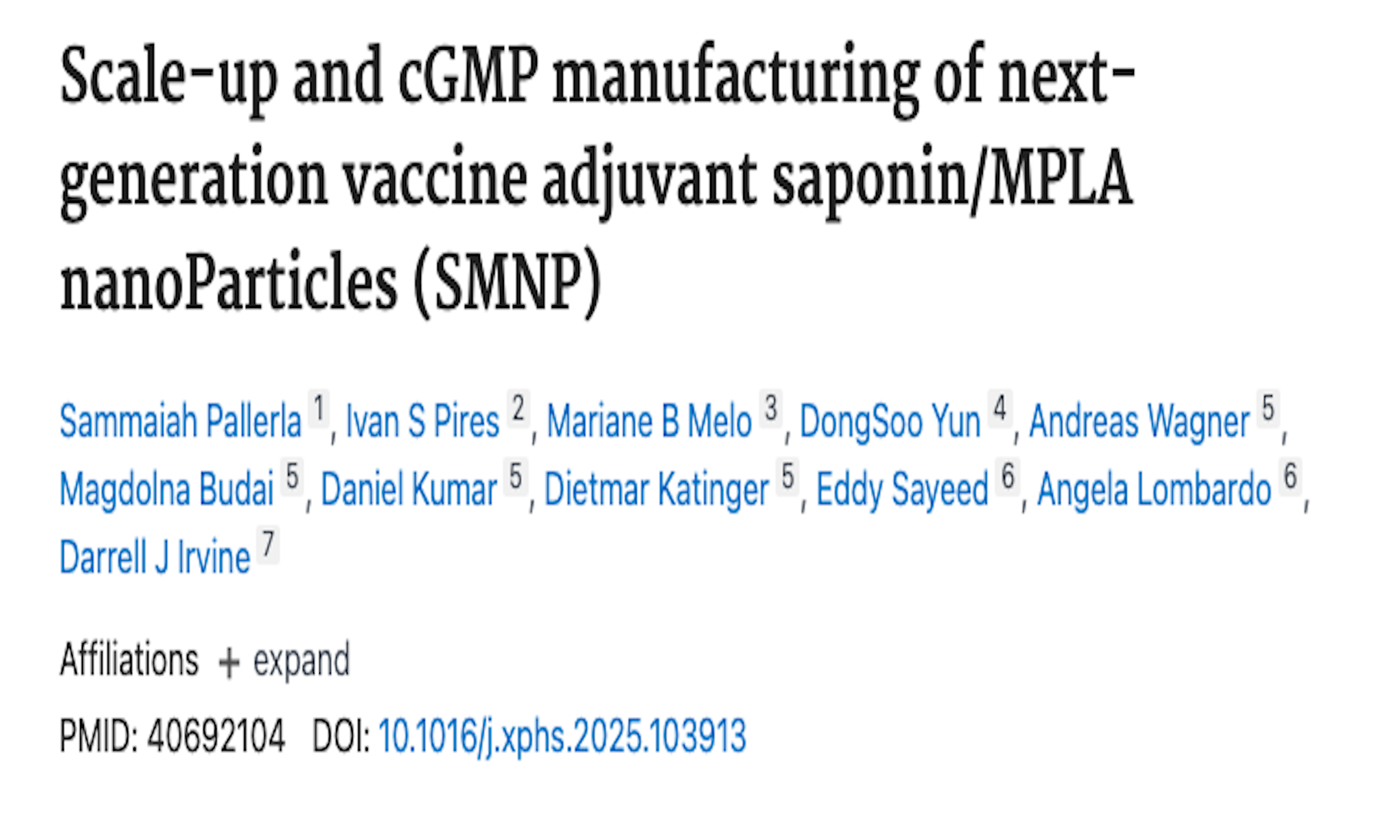 Pallerla, S., et al. Scale-up and cGMP manufacturing of next-generation vaccine adjuvant Saponin/MPLA NanoParticles (SMNP). J Pharm Sci, 2025 Jul 19, 114(9):103913.