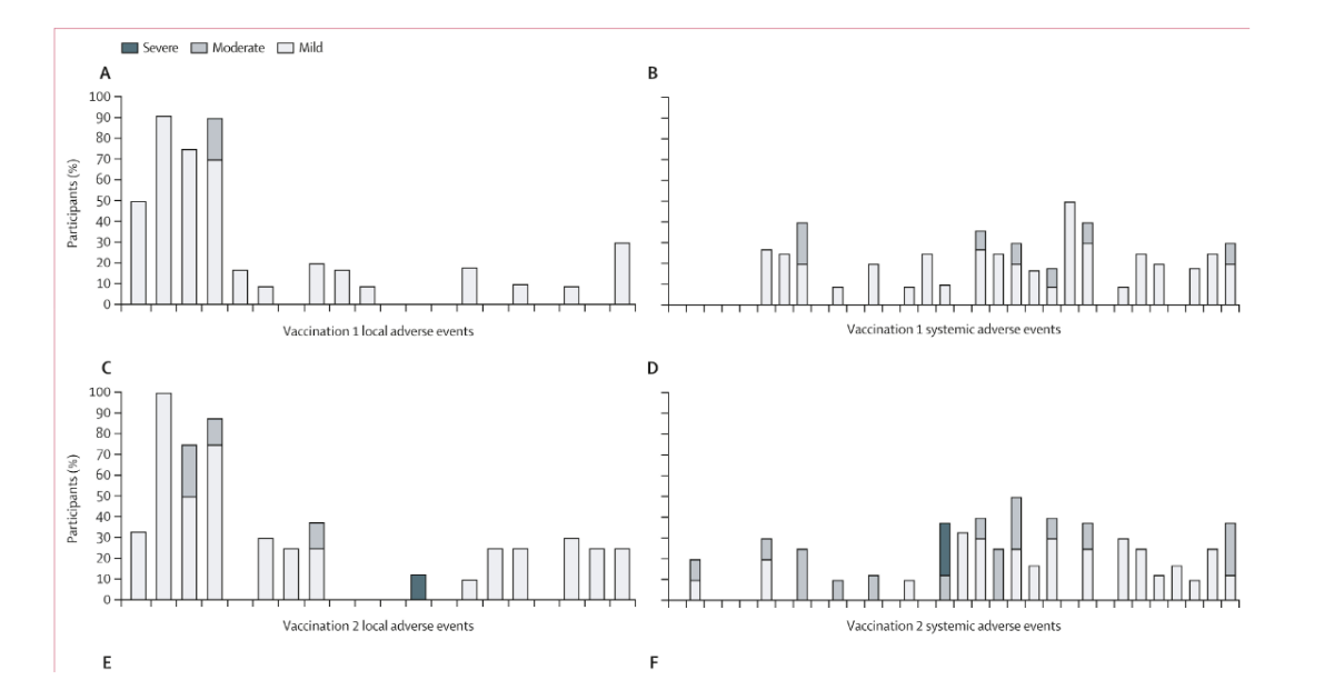 En el estudio de fase 1a, se produjeron 239 acontecimientos adversos; en el estudio de fase 1b, se registraron 12 acontecimientos adversos entre los grupos de estudio. Las vacunas se toleraron bien, y la mayoría de los acontecimientos adversos locales y sistémicos fueron leves. No se consideró que ningún acontecimiento adverso grave estuviera relacionado con la vacunación, y era poco probable que los dos acontecimientos adversos graves estuvieran relacionados con la vacuna. El documento demuestra que la R21 con adyuvante Matrix-M tiene un perfil de seguridad aceptable.